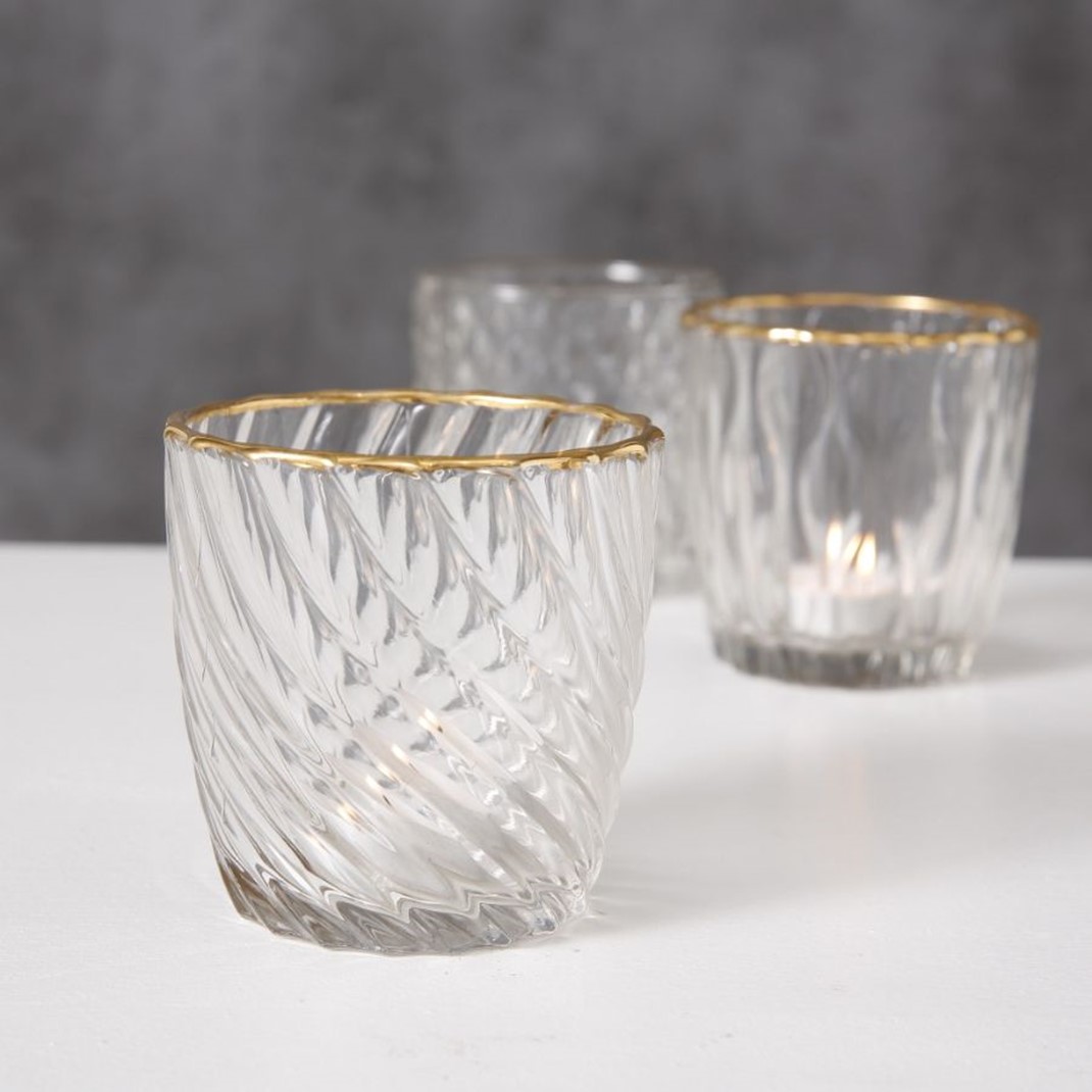 Set of 3, Transparent Votives with Gold detail, in 3 styles