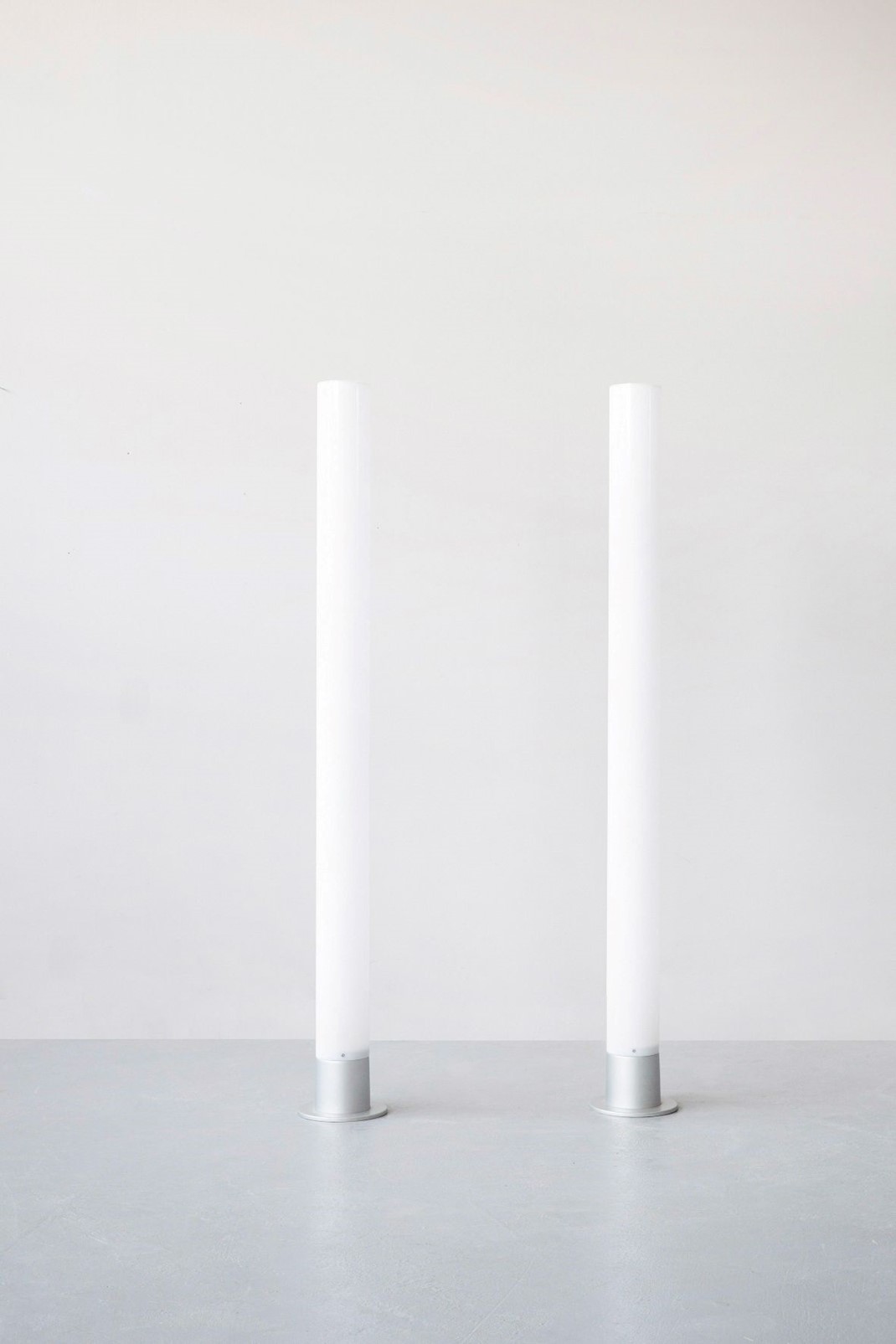 Floor lamp providing indirect and diffused light. Silver powder-coated steel base.
